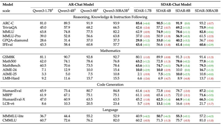 研究人员基于 Qwen3 系列的 1.7B、4B、8B-dense 和 30B-A3B MoE 模型,通过「继续预训练 (CPT) + 指令微调 (SFT)」的两阶段流程,训练出 SDAR-Chat 系列模型,并与采用完全相同流程训练的 AR-Chat 基线进行全面对比。