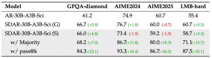 图注:AR-30B-A3B-Sci and SDAR-30B-A3B-Sci 性能比较