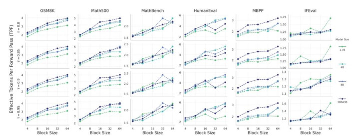 模型越大,加速越明显:更强的模型预测更自信,能一次性并行生成更多 token,实现更高的 TPF,形成「能力与速度」的良性循环。