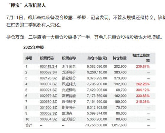 随着基金二季报陆续披露,一只成立不足4个月的新基金引发市场关注。德邦高端装备混合自2025年3月成立以来,便将宝全押在人形机器人板块,半个多月内股票仓位飙升至9成以上。